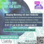 Ziel des Workshops ist, sich die Methode des kollektiven Kartierens anzueignen und so nicht nur aktuelle Orte feministischen Aktivismus zu betrachten und geschlechtsspezifische Aus- und Einschlüsse im Stadtraum intersektional zu analysieren und festzuhalten, sondern auch in Verbindung mit dem Material des Archivs historische Kontinuitäten und Brüche nachvollziehen zu können: Wie war die Entwicklung von Frauen zu queeren Vereinen? Wo in der Stadt gab es Zentren der Frauenbewegung? Welche Symbole und Codes werden und wurden in lokalen Frauen*Publikationen verwendet?